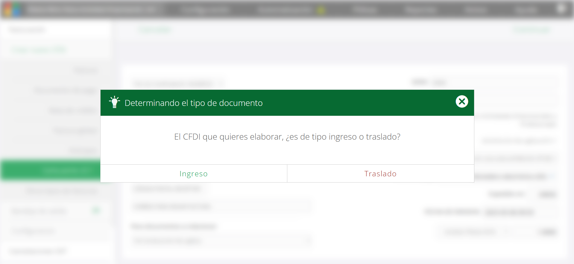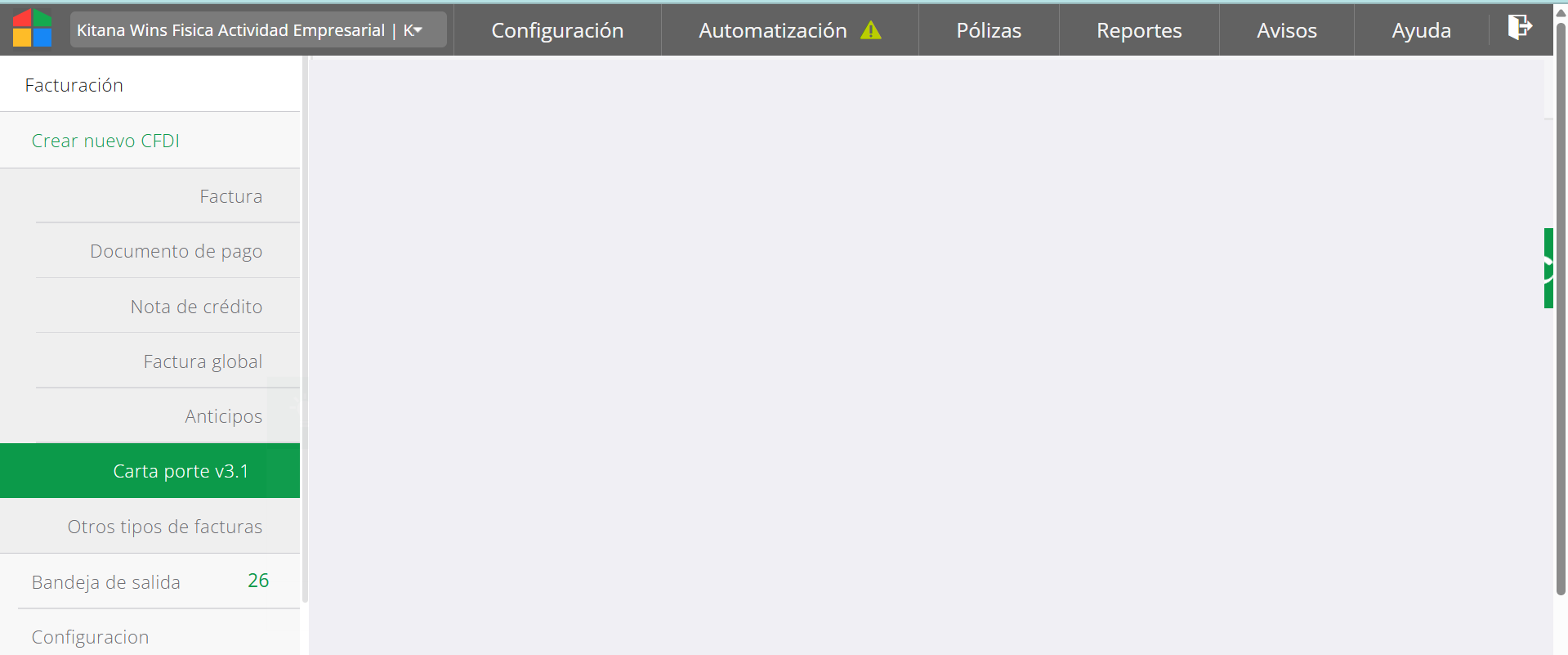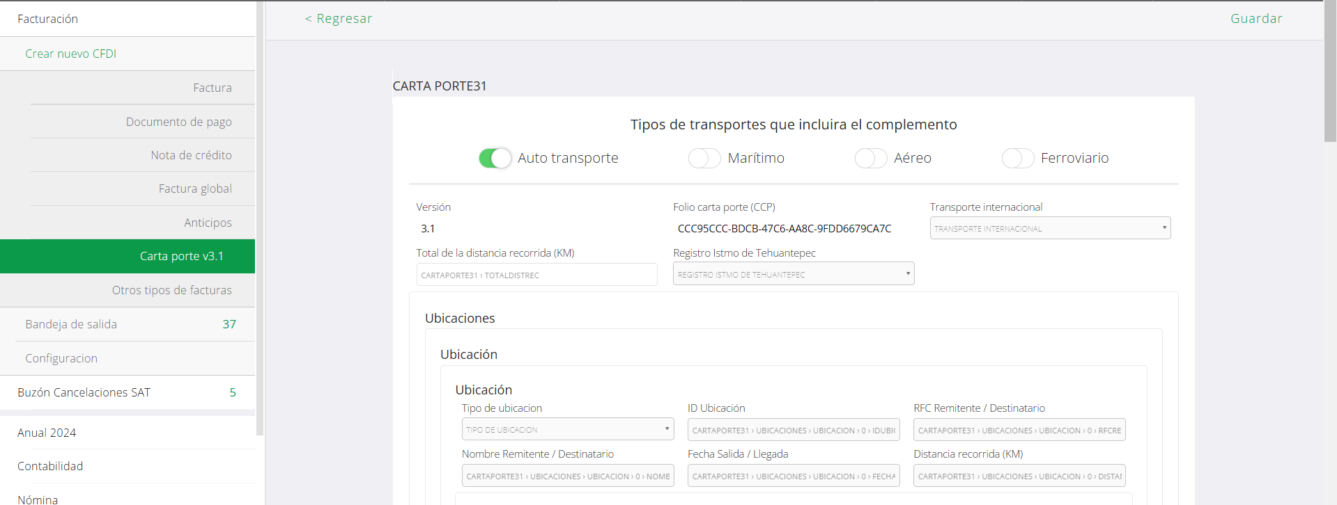 Cómo el resto de documentos en sistema las opciones que se precargan y/o no son editables se han generado acordé a guía de llenado.Una vez que se tenga activa la opción de carta porte en el menú de la izquierda debe darse clic para iniciar el llenado del documento (de no tenerla la ruta es configuración u otros tipos de facturas).