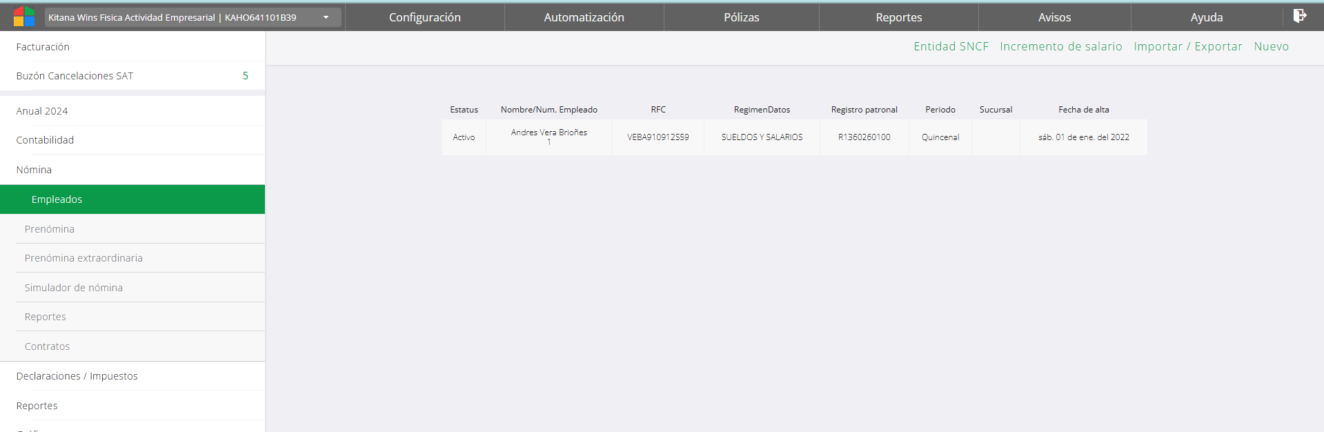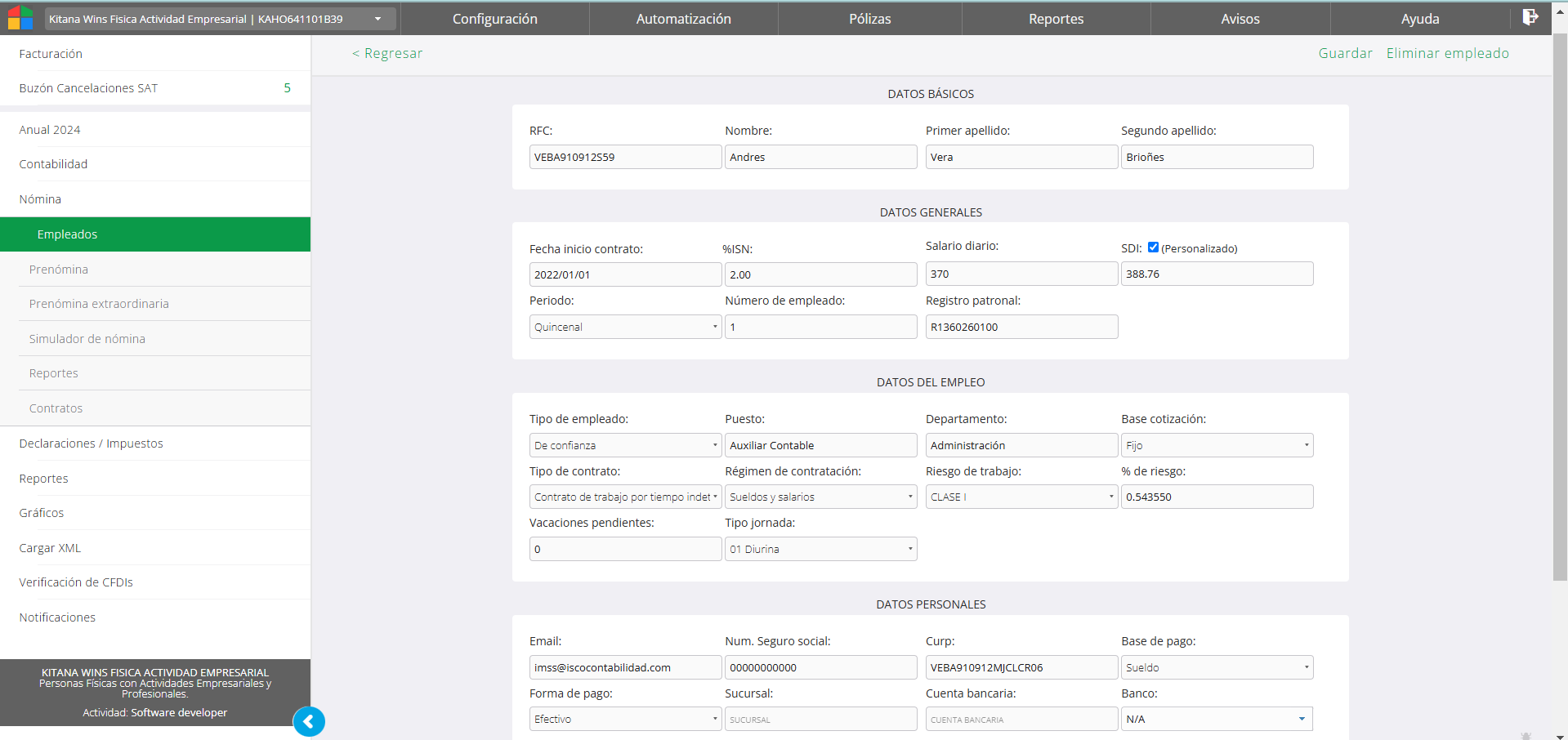 Los datos básicos (personales) y de ubicación son los que se utilizan para generar el CFDI del recibo por lo qué deben coincidir con la constancia para evitar errores de cálculo. Desde este apartado además se realiza el incremento de salario y la asignación de zona salarial.