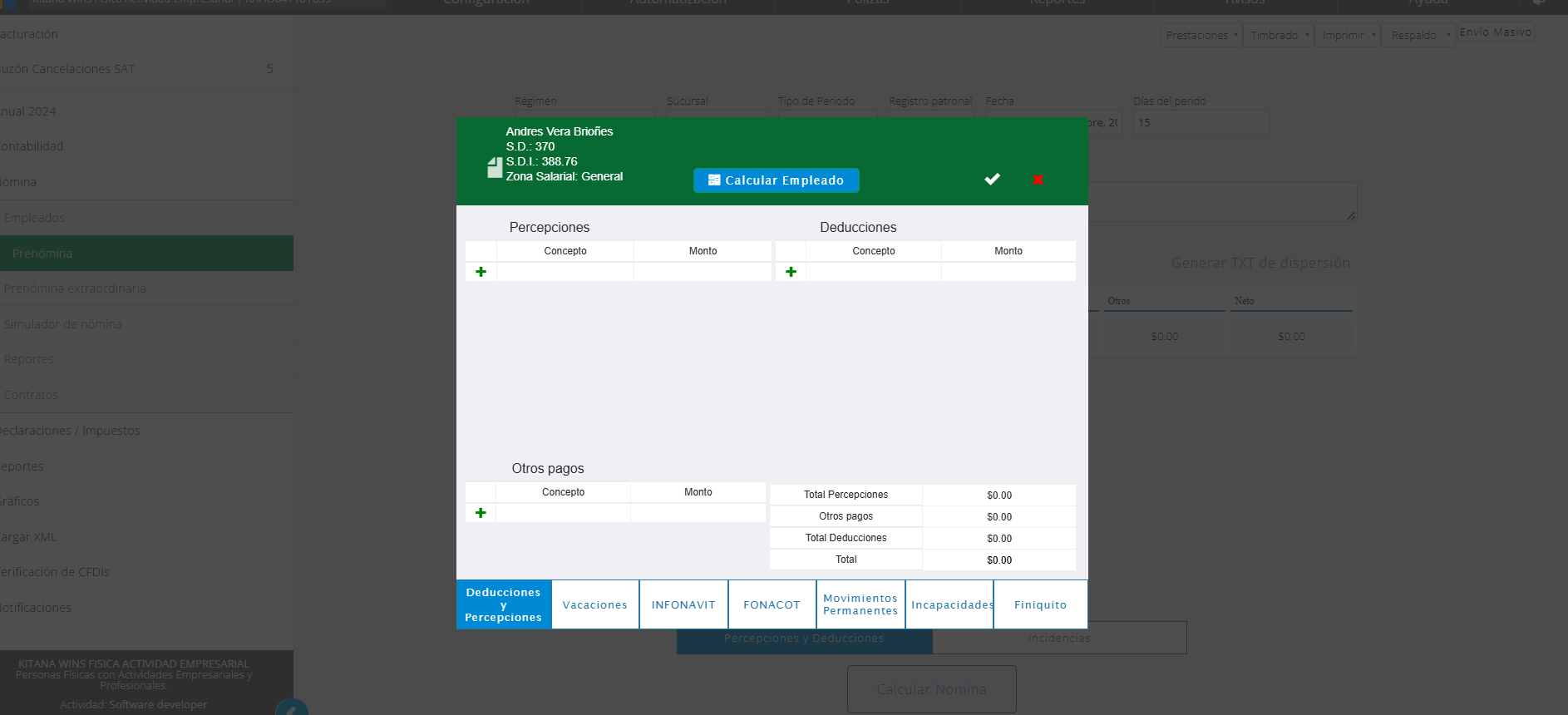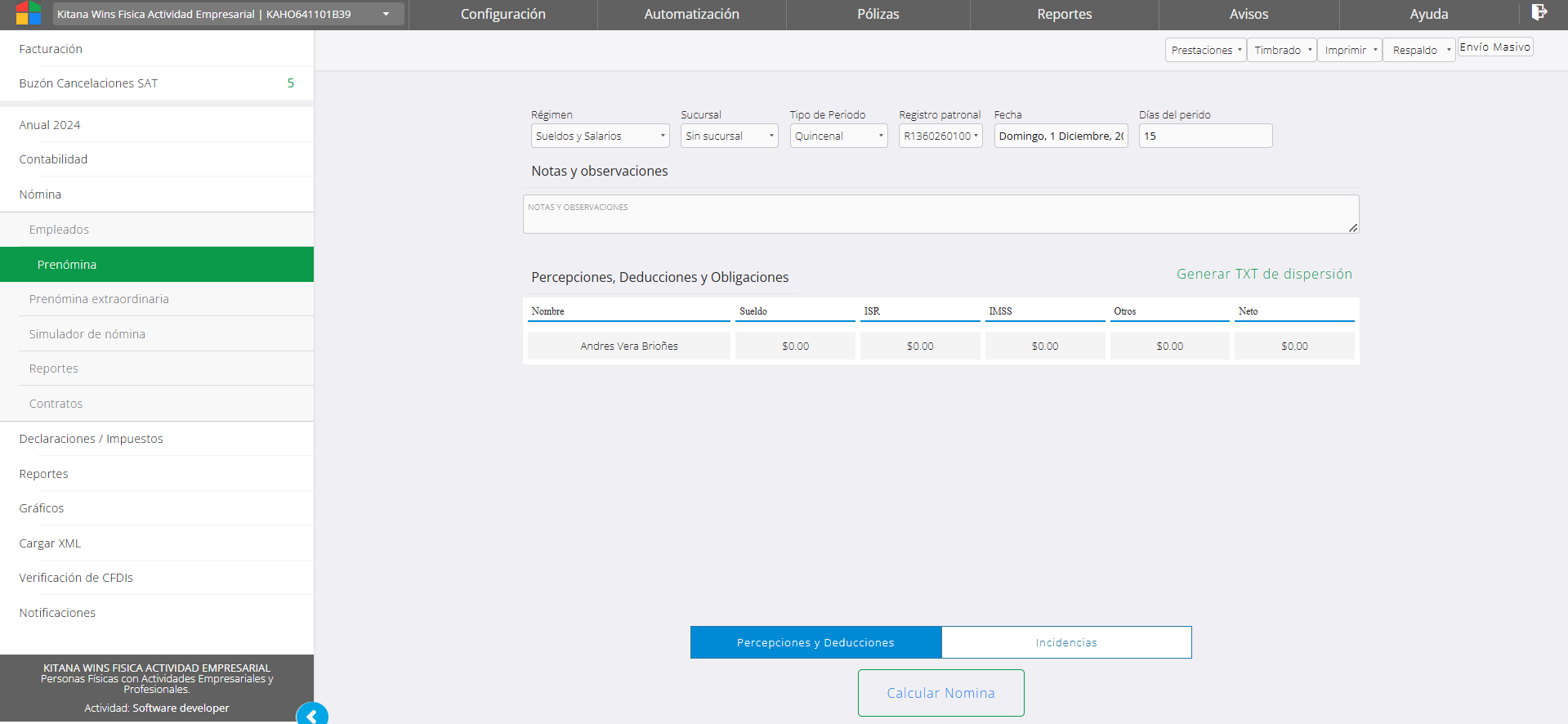 El módulo ofrece el cálculo y timbrado ilimitado de los recibos de nómina. La sección de prenómina es de entre las opciones del módulo la de mayor recurrencia, ya qué es en este apartado dónde se realiza el cálculo y timbrado de los periodos de pago. Se debe realizar el registro al menos de un empleado para utilizar las funciones de prenómina, si no hay empleados no se puede hacer uso de cálculos. Los periodos con los que se cuenta para cálculo son: semanal, decenal, catorcenal, quincenal y mensual.