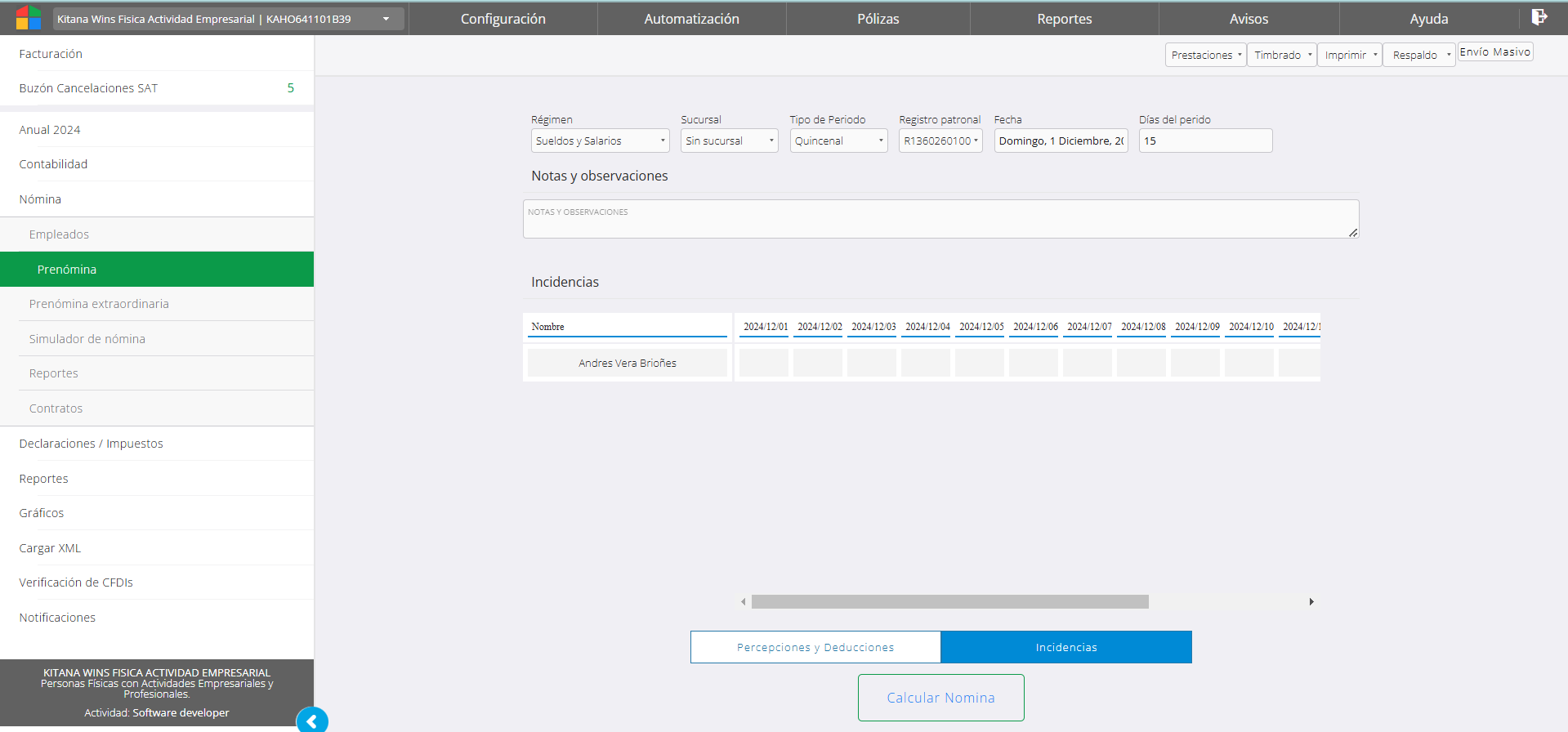 Percepciones y deducciones genera la vista integral del cálculo con los importes segmentados en cuatro tipos. Al dar clic en el botón incidencias se muestra la vista del calendario para registrar las incidencias por día.