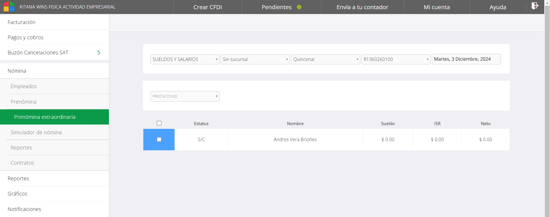 Este apartado es para crear recibos de pago que no son salarios habituales, para SAT esto son periodos extraordinarios. En sistema se utilizan para las tres prestaciones anuales: aguinaldo, vacaciones y PTU. Aunque también se puede realizar el cálculo de estos pagos en un periodo de prenómina en la mayoría de los casos siempre será recomendable realizarlo en la opción extraordinaria. Al igual que en la prenómina se deben seleccionar los datos para que se muestre el listado de empleados. Este apartado al ser no habitual no cuenta con registro de incidencias o una vista del cálculo sobrerecibo.
