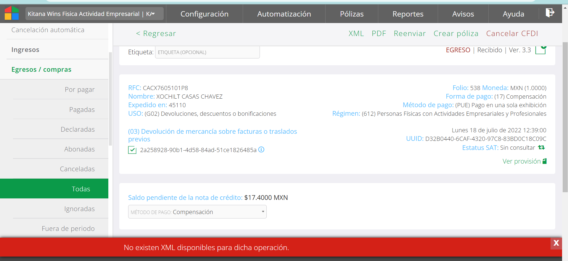 Existen dos lógicas para mostrar compensación documentos a compensar en una nota de crédito. La más común es mostrar él o los documentos relacionados en el XML, y le llamaremos la lógica de relación. Anterior a que esta información apareciera en el XML (versión 3.3 de facturación) la lógica es mostrar cualquier factura del emisor de la nota (RFC) que cuenta con un saldo igual o mayor al total de la nota de crédito, la llamaremos lógica previa a relación. Cuándo la alerta es que no existen XML disponibles para compensar es que no cumple los criterios de ninguna de ambas lógicas.