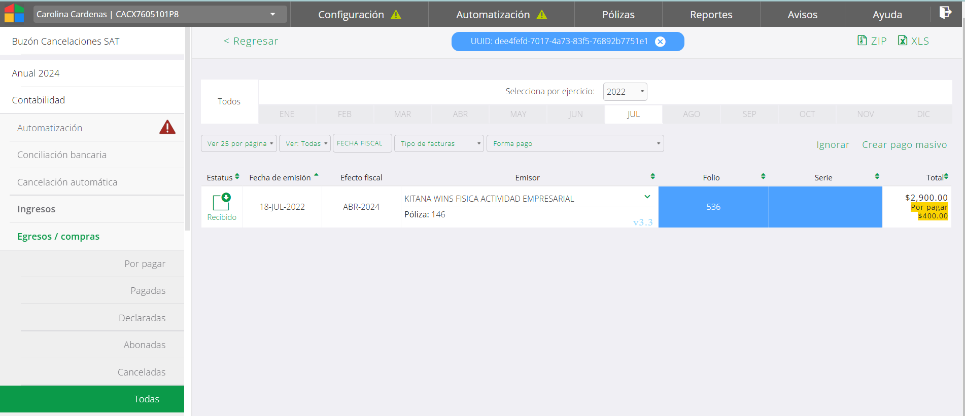 En la siguiente imágen se muestra el caso de una póliza de compensación dónde no se ha ingresado a factura para creación de póliza.