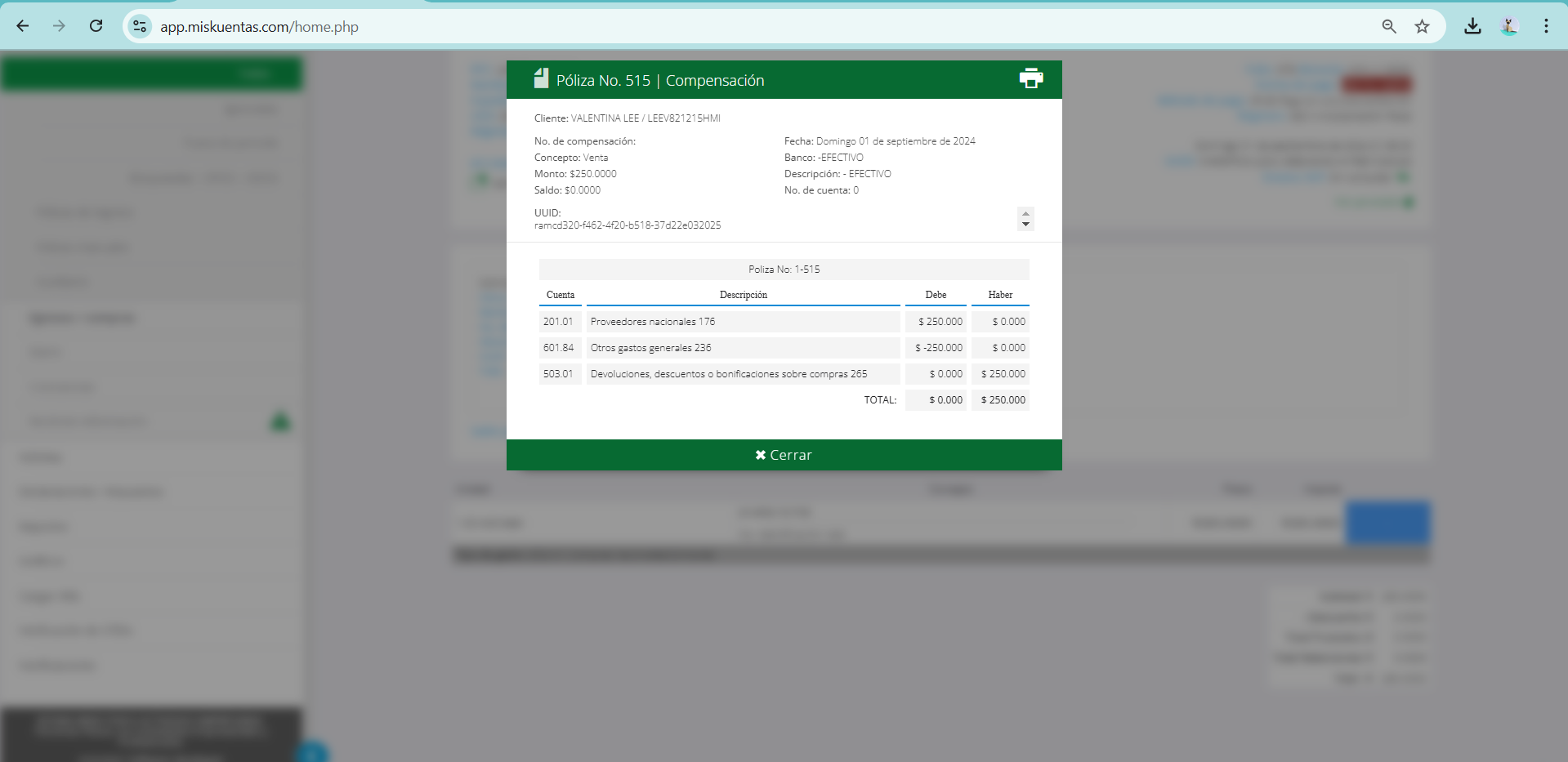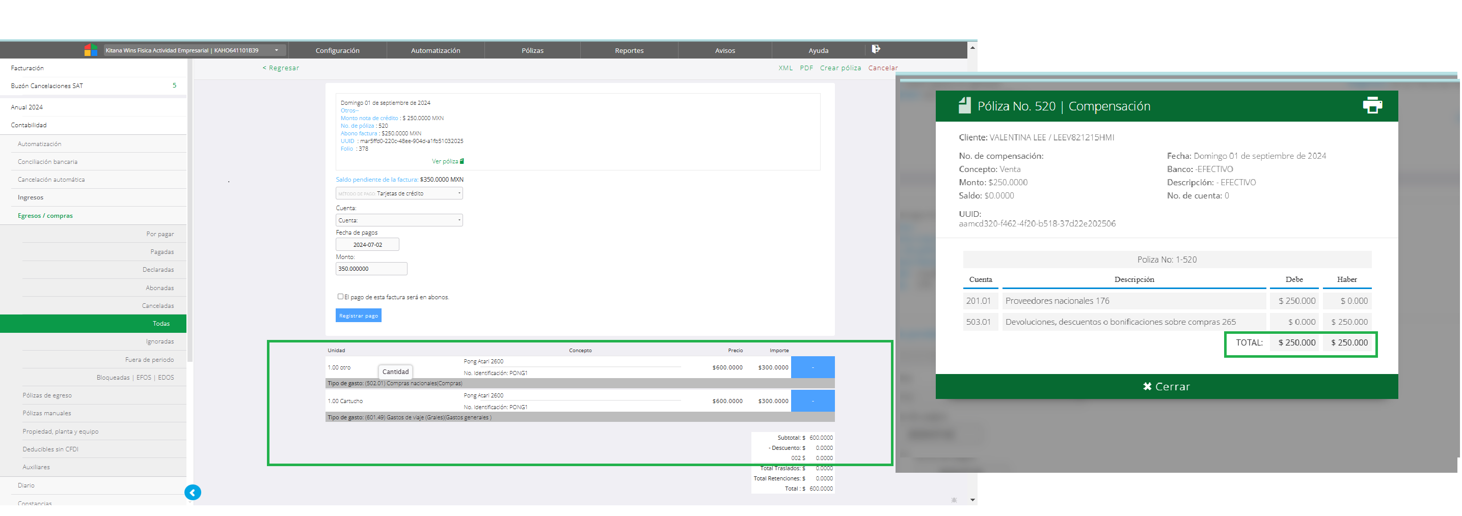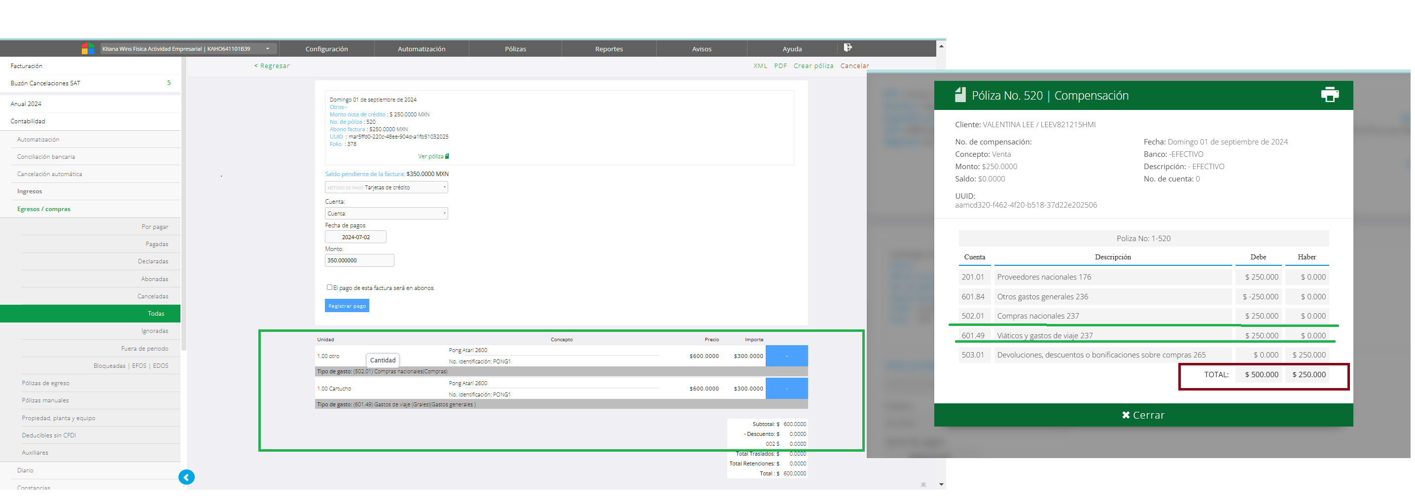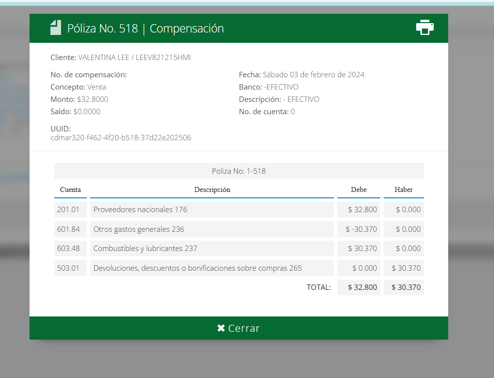 La póliza de compensación a diferencia de la creación de las pólizas habituales en documentos necesita de un paso adicional, y es crear la póliza desde la factura (sí los proveedores estan clasificados sistema lo hará en automático). Al crear la póliza en la nota de crédito es un pre paso, se debe acceder a la factura y verificar si cuenta o no con la póliza creada. Se debe tomar el UUID de la póliza generada en la nota de crédito para localizarla de forma más sencilla.