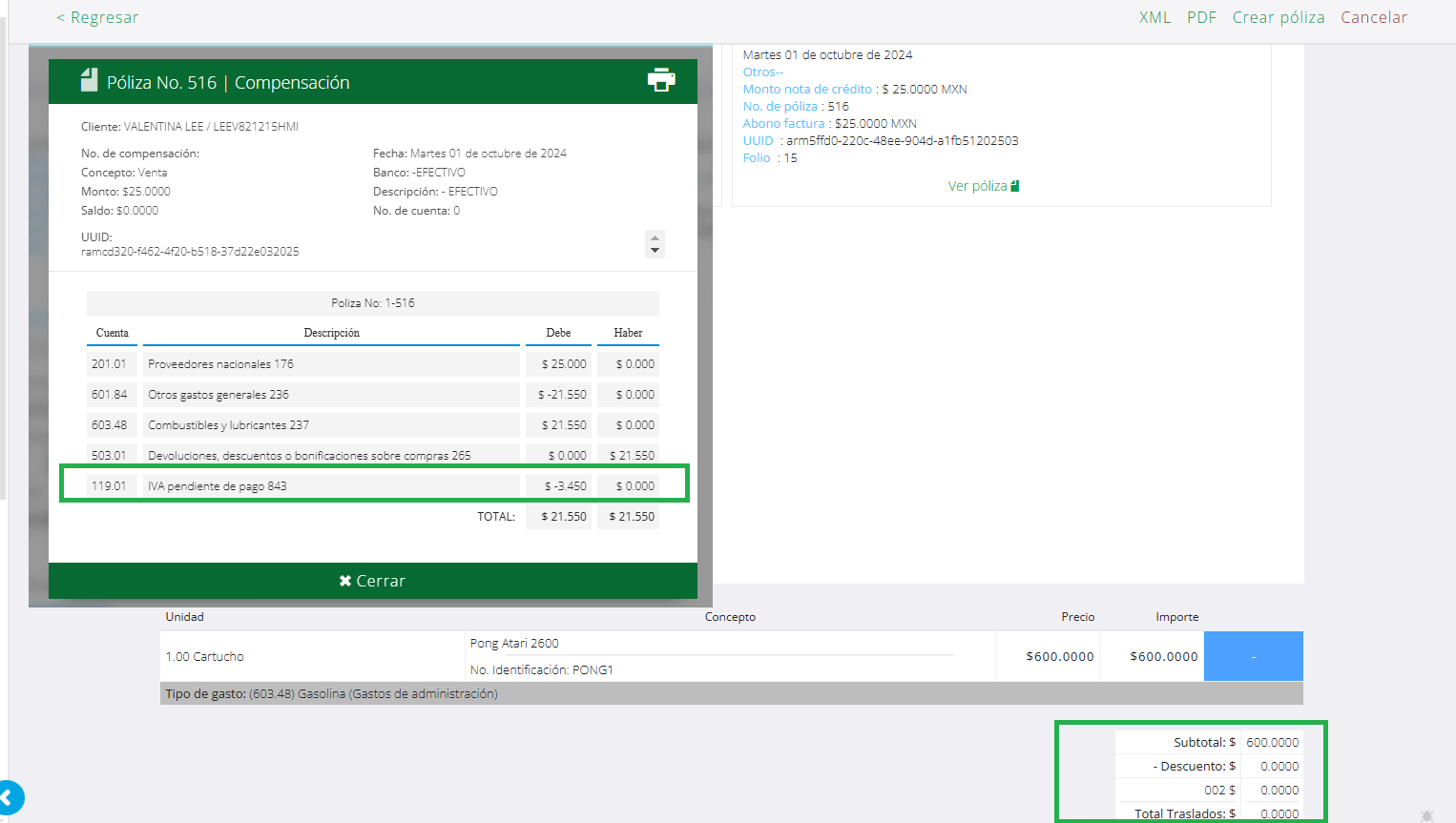 Sobre el IVA en la póliza de compensación se realiza la afectación sin problema cuando la factura y la nota de crédito cuentan con mismo traslado de IVA (ambos documentos son tasa 0, 16 u 8) pero en el caso de que la factura cuenta con actividades mixtas el importe del impuesto puede dar problemas para cuadrar póliza o puede estar la póliza cuadrada pero afectando de forma errónea otros valores en sistema. En el siguiente ejemplo se tiene una factura que es tasa cero IVA, y se le aplicó una nota de crédito que cuenta con IVA al 16 trasladado. La póliza ajusta el IVA acreditable aún cuando la factura no cuente con él.