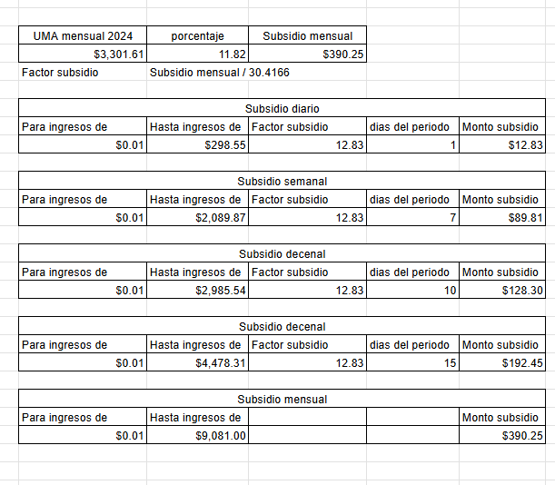 Antes de Mayo 2024 el subsidio al empleo se asignaba conforme a las tablas de subsidio por período (diario, semana, decena, quincena, mes) vigentes (se pueden encontrar como tablas de ISR y subsidio SAT por ejercicio), pero a partir de Mayo 2024, conforme a decreto presidencial, el subsidio mensual se calcula sobre porcentaje de la UMA mensual vigente.