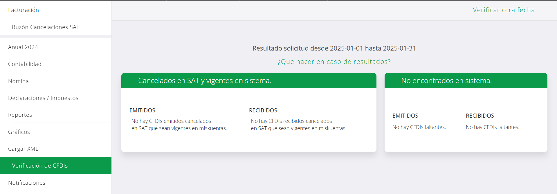 Se muestran dos resultados, el primero es sobre estatus para verificar que lo que se tiene cancelado en SAT también se encuentra marcado cómo cancelado en sistema. El segundo es sobre existencia, lo que que se valida es que los XML (mediante UUID) en el periodo que se tienen en sistema corresponden a los mismo que se tienen en SAT. Estos dos resultados se segmenta en documentos emitidos y recibidos para que el usuario pueda localizar si es un ingreso o egreso.