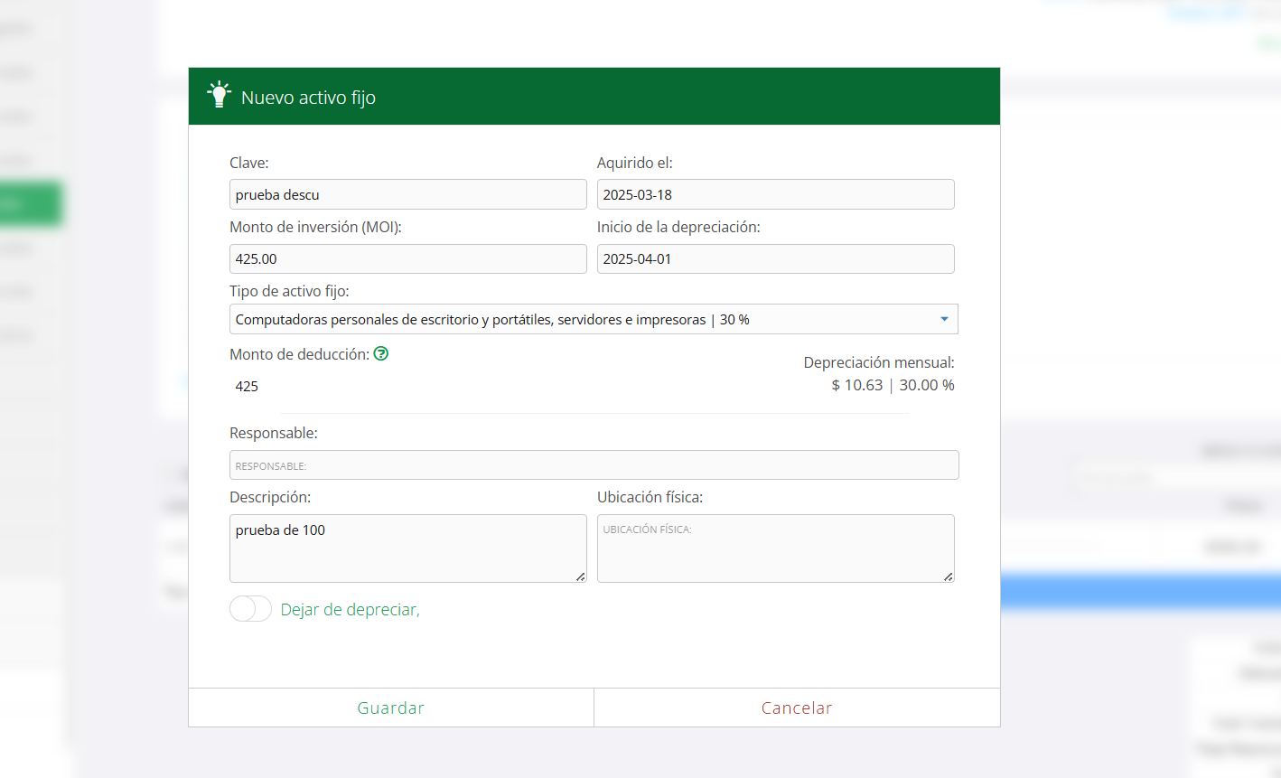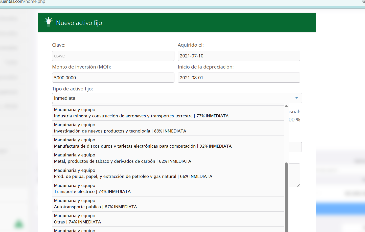 Al seleccionarla se activa el cuadro de depreciación y es necesario llenarlo. Los porcentajes se cargan acorde al tipo de activo y en algunos casos al régimen (algunos tiene facilidades) y esto tiene sujeto legal en ley de ISR. Por lo que sólo cambiarán si se modifica la ley, si un usuario indica que necesita un determinado porcentaje y no se encuentra activo se debe solicitar el sustento legal de lo que indica.