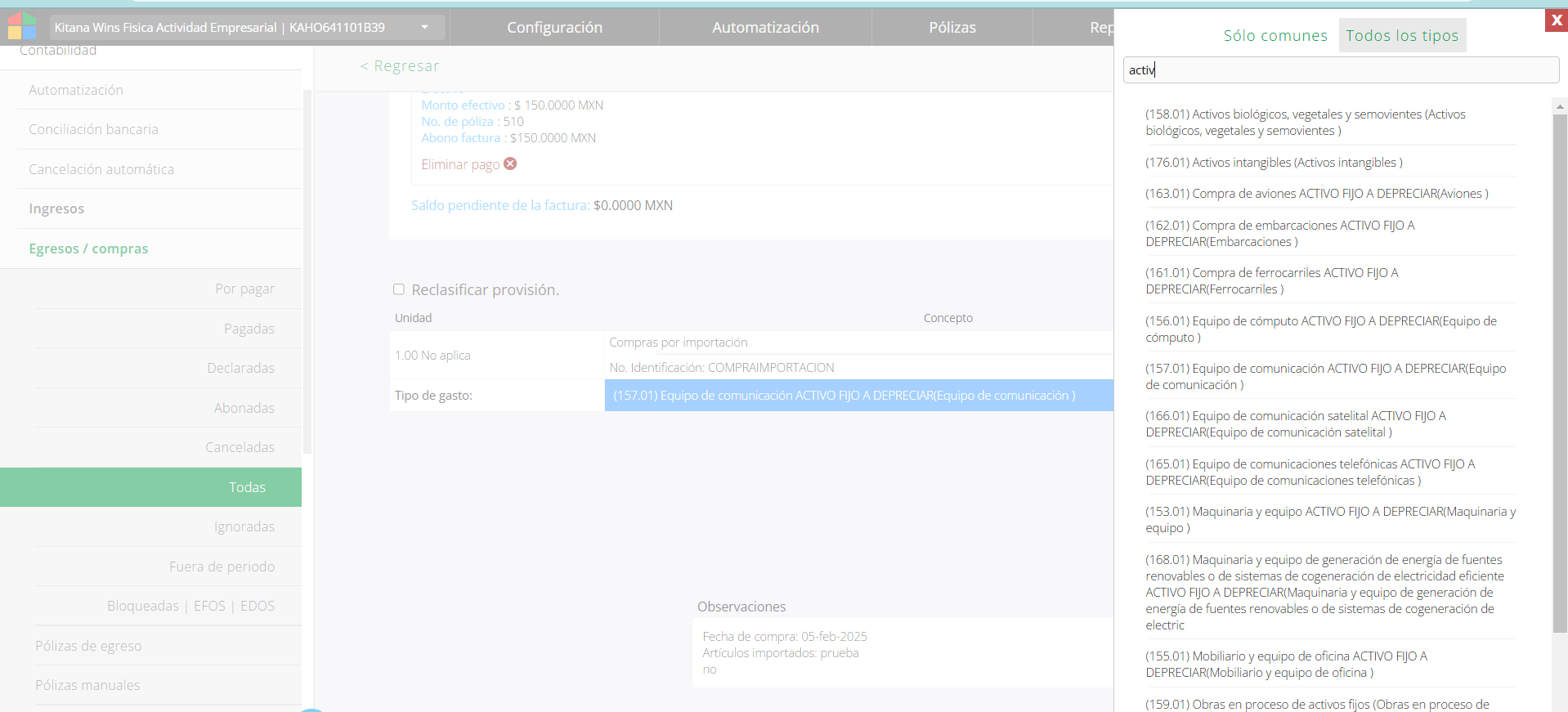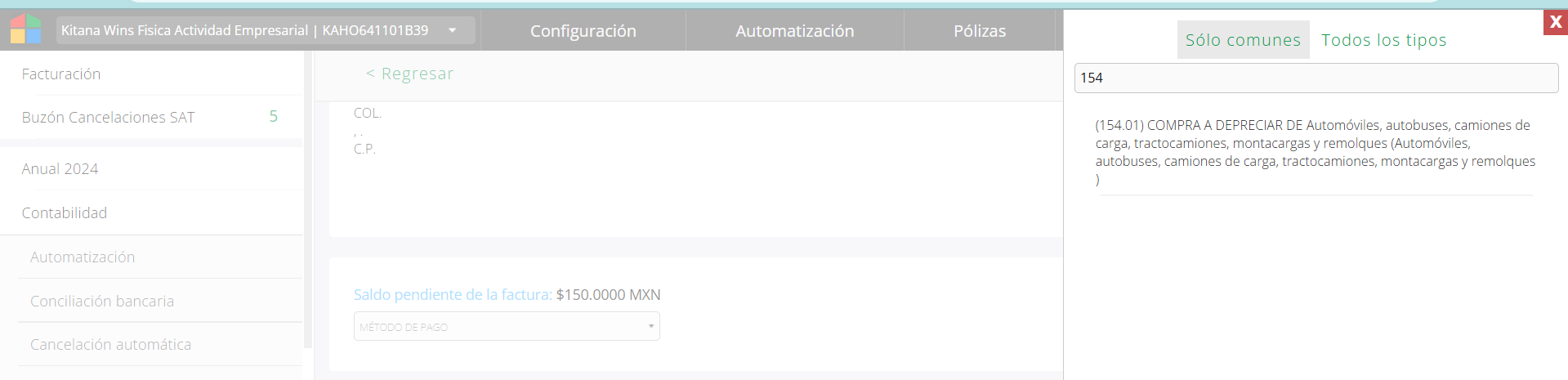 La forma de realizarlo desde factura es: localizar la cuenta de activo desde factura debe dar clic en la barra azul bajo el concepto de la factura, para activar todas las opciones del catalogo de cuentas. Si lo hace desde aplicar a todos los conceptos solo aparecen las cuentas más comunes, siempre debe ser desde ¨todas las opciones.