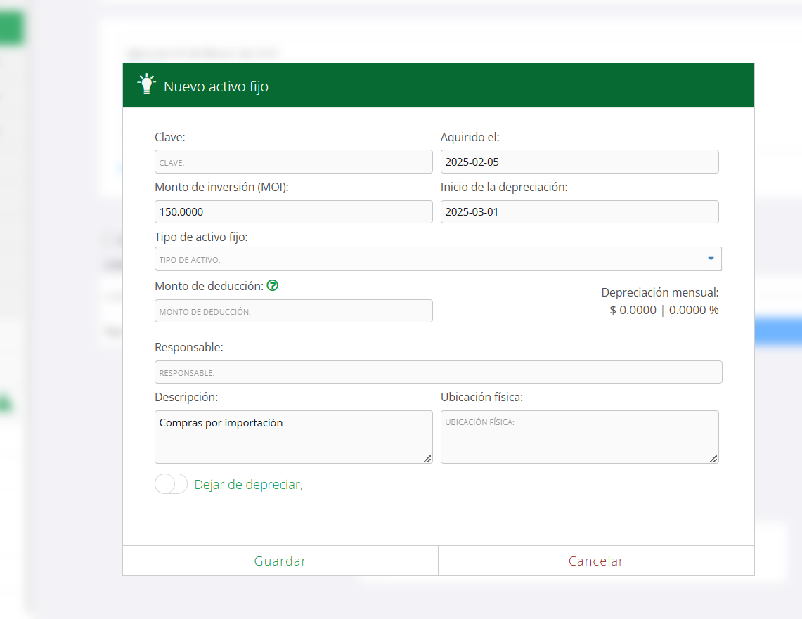 El sistema permite el registro de datos a depreciar de un activo fijo para realizar la depreciación mensual de forma automática y hay dos opciones de realizar: desde factura (la más común) y desde saldo inicial (para activos fijos que se adquirieron antes del periodo inicial en sistema y que siguen depreciandose después de dicho periodo)