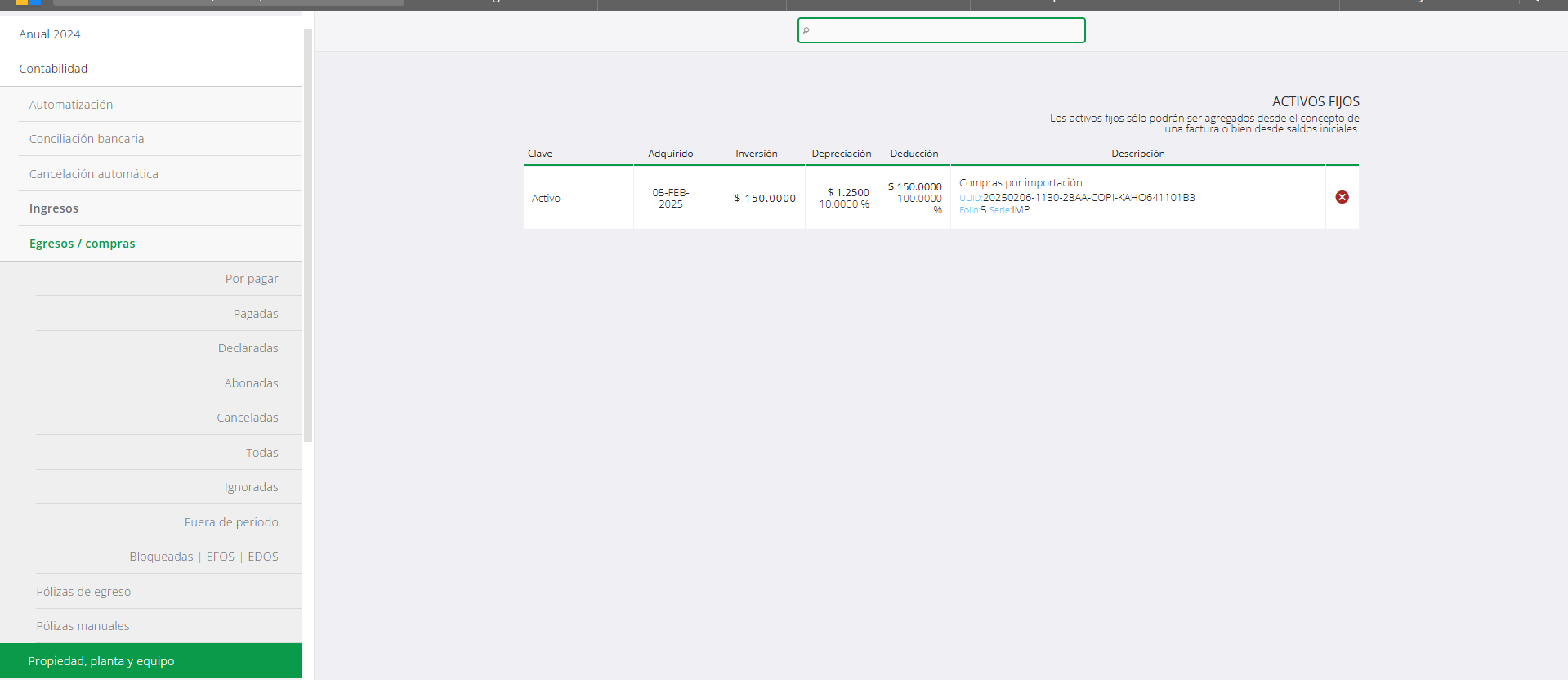 Para ver los activos registrados y su datos de depreciación se accede al módulo de contabilidad - egresos - propiedad, planta y equipo.