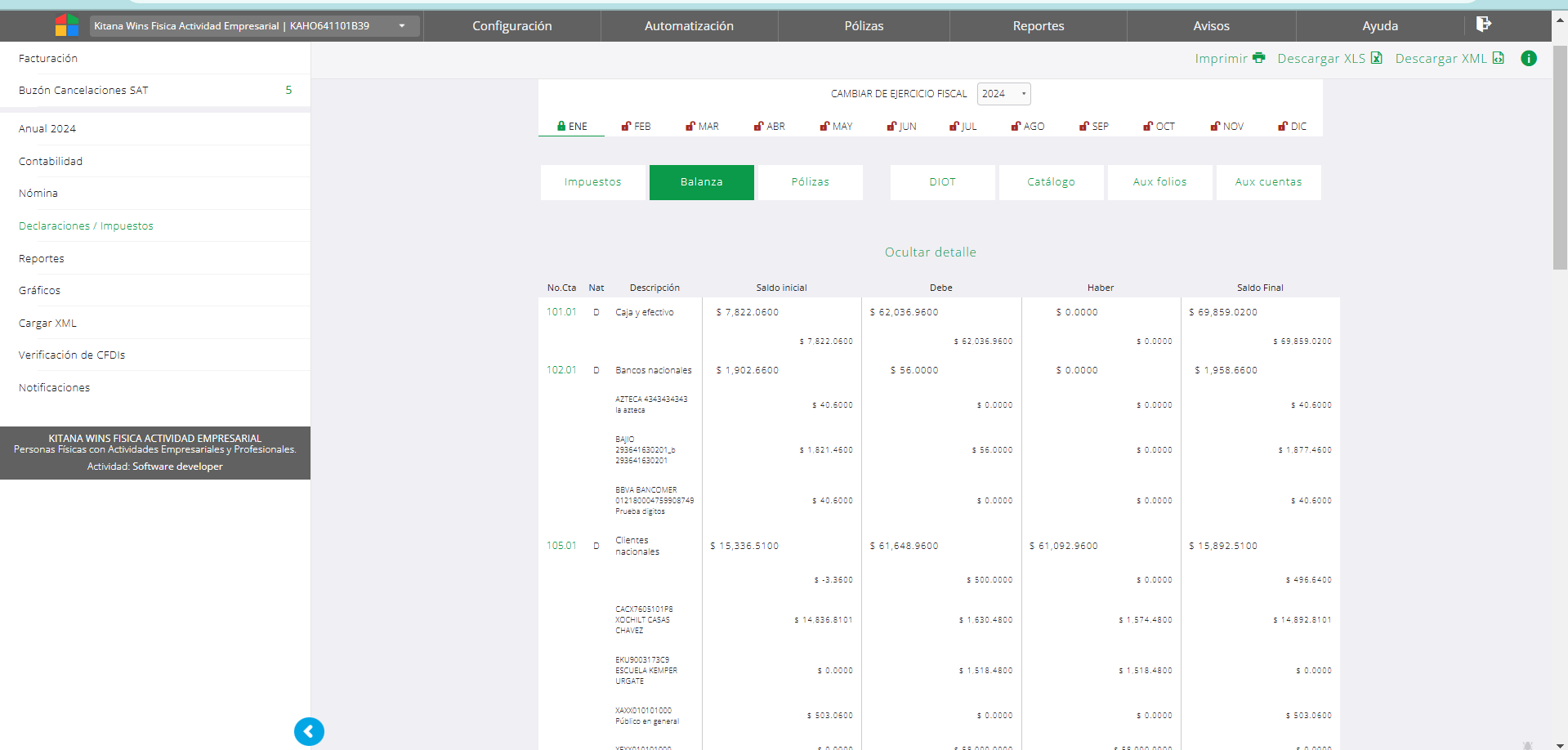 El formato es mensual, a 2024 no se cuenta con un forma anual (todos los movimientos del año en una balanza). La balanza se genera con la acumulación de la información de pólizas del periodo. Por tal si es necesario revisar la integración de los datos siempre se deberá recurrir a las pólizas (la ruta para acceder a ellas es similar, solo selecciona el botón de pólizas en lugar de balanza).