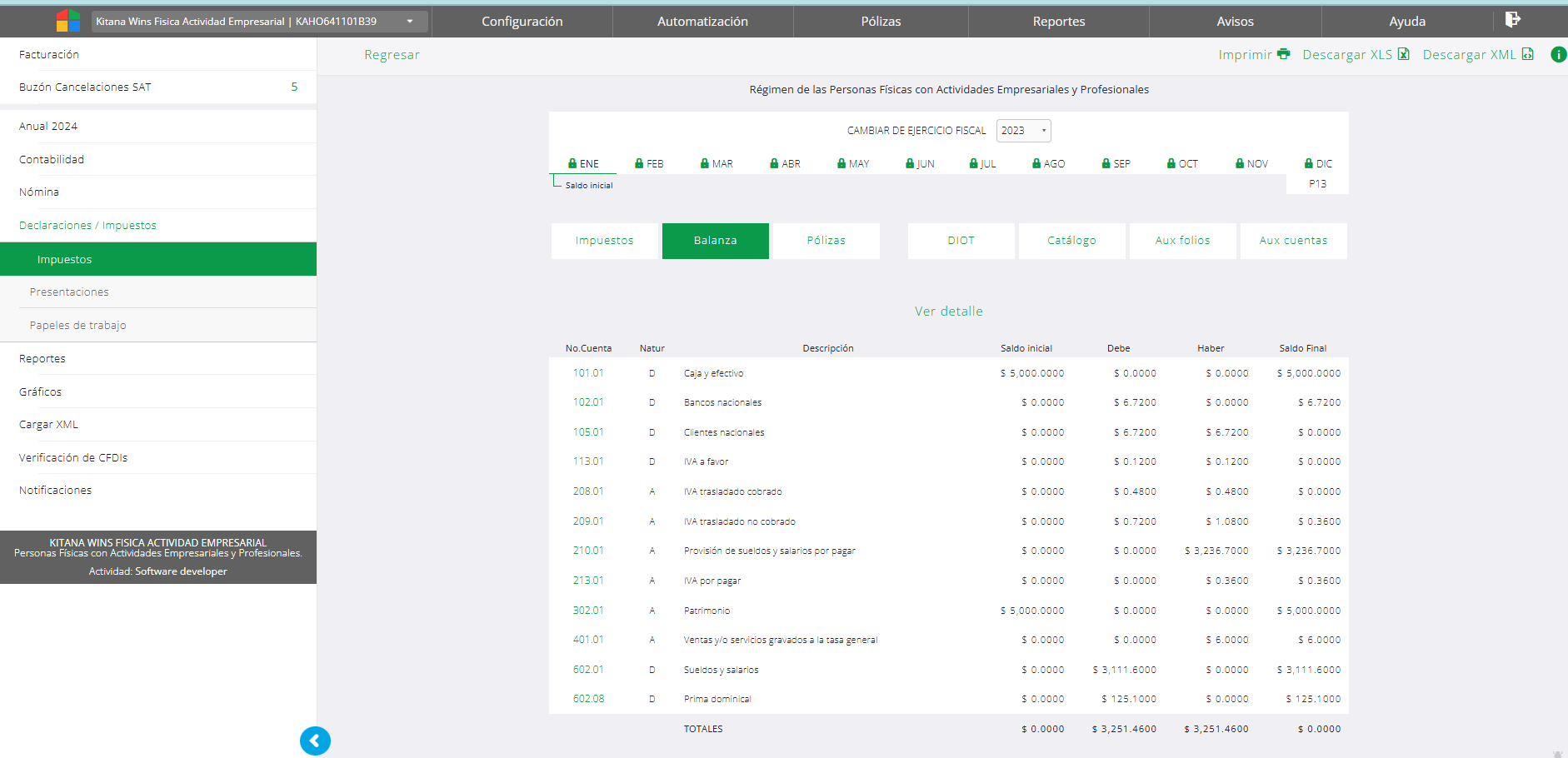 Es el reporte financiero más consultado por los usuarios y el cuál se genera en archivos XML para envío a buzón tributario SAT, por ello la ruta de localización es en declaraciones y no desde el apartado de reportes. Es necesario que se hayan cargado los saldos iniciales en la configuración del sistema para que la información de la balanza se genere de manerá adecuada. Para acceder a ella se debe ir al módulo de declaraciones , seleccionar impuestos, un ejercicio -año- y un mes. Una vez que se muestran los botones se selecciona balanza.