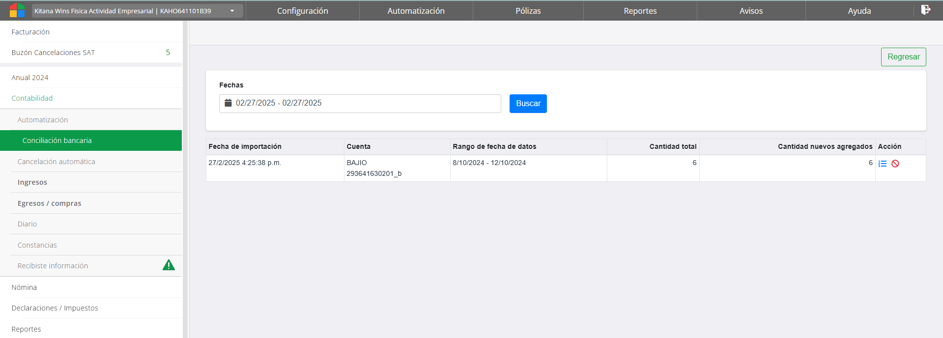 Para eliminar un periodo de conciliación lo que debes acceder a consulta conciliación - consultar archivos cargados, y cuándo se tenga localizado dar clic en el icono en rojo anular.