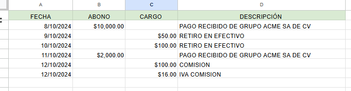 El archivo de carga debe ser extensión XML, TXT, CSV o XLS . Y debe contar con un formato de información de movimientos por día ordenados en columnas con encabezado que indica el tipo de dato; siendo los datos mínimos la fecha, cargo, abono (puede aparecer como ingreso o egreso) y la descripción. No todos los formatos de fecha son válidos (se sugiere utilizar el más común dd/mm/aaaa).