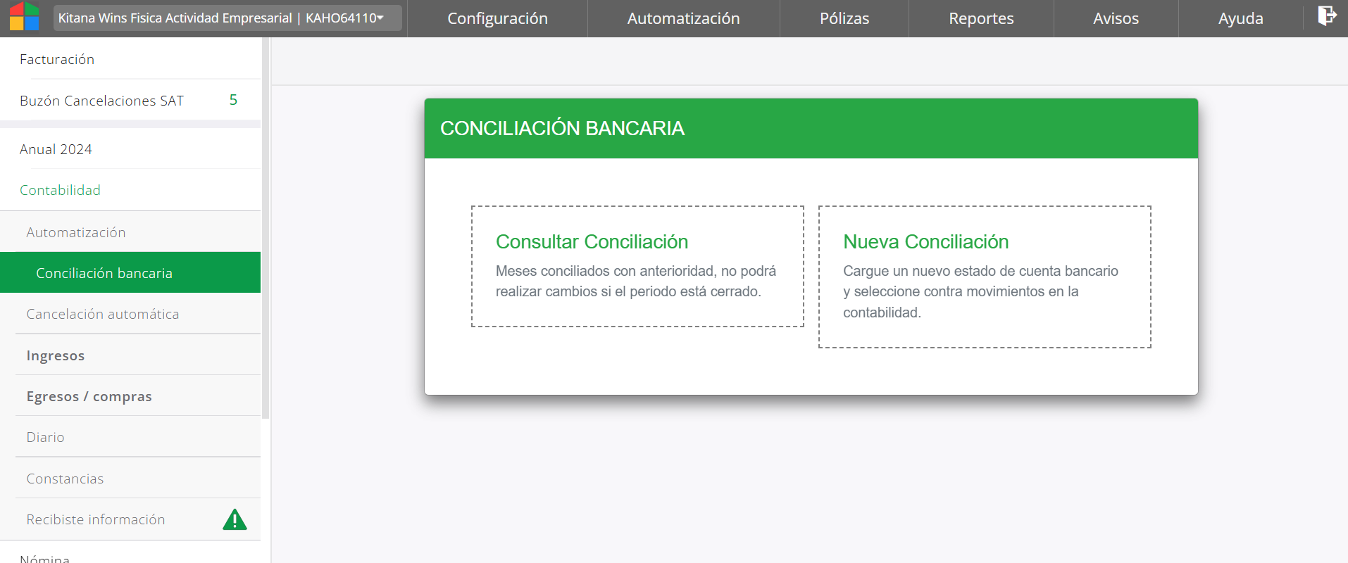 Al seleccionar la opción en el menú lateral aparecerán las dos opciones de trabajo, la primera para consultar conciliaciones ya cargados y la segunda para cargar nueva. En la opción de cargar nueva se habilita el listado de las cuentas bancarias registradas en configuración (Se selecciona banco primero y después número).