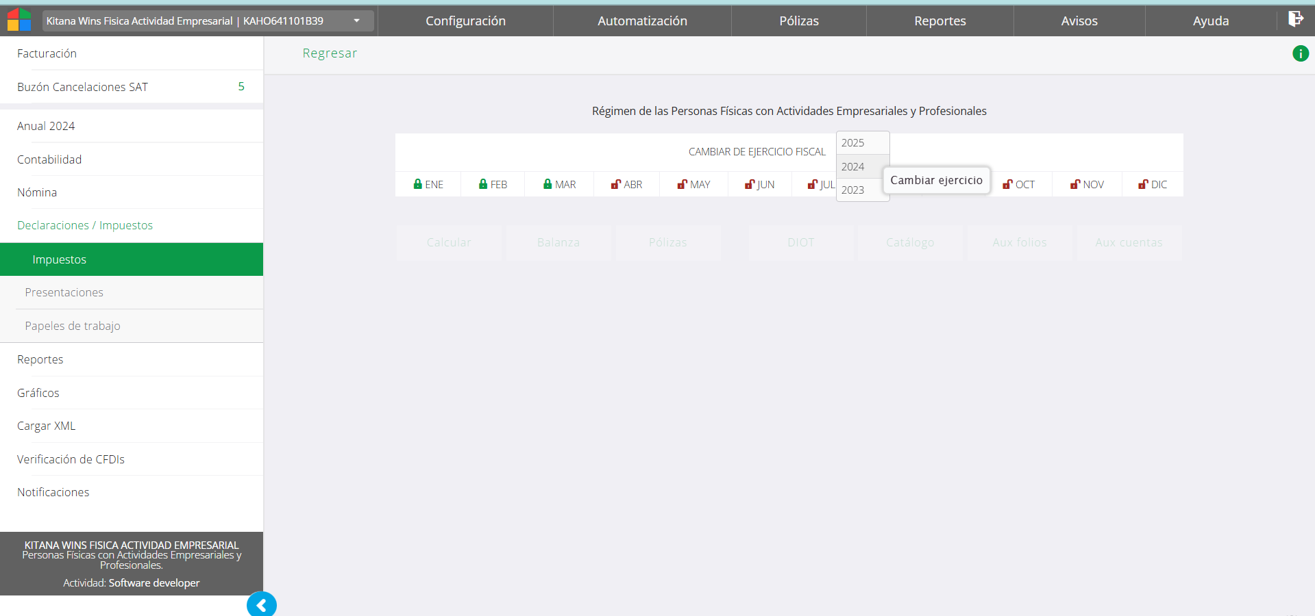 La selección de ejercicio (año) está determinado por el sado inicial, es decir solo se muestran cómo activos los ejercicios desde el año que se ha asignado al saldo inicial en configuración. Para acceder a las opciones, es decir activar los botones para ingresar a los datos, siempre se debe seleccionar un periodo, qué en mayoría es mensual. En el caso de RIF (régimen de incorporación fiscal) es bimestral.