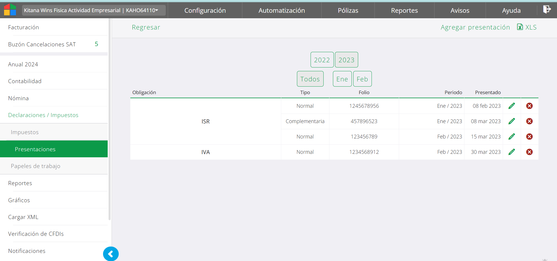 La opción de Declaraciones - presentaciones tiene cómo finalidad que el usuario registre los datos de las presentaciones de SAT. Es decir una vez que ha cumplidado con la obligación de presentar impuesto o informativa y cuenta con el acuse de recibido del SAT podrá registrar estos datos en el área de trabajo. La idea es que se pueda consultar estar información para que no debe abandonar el sistema para localizarla. Por periodo se cargan los datos de los acuses de las declaraciones y pueden ser muy útiles en el de control de saldos de impuestos.